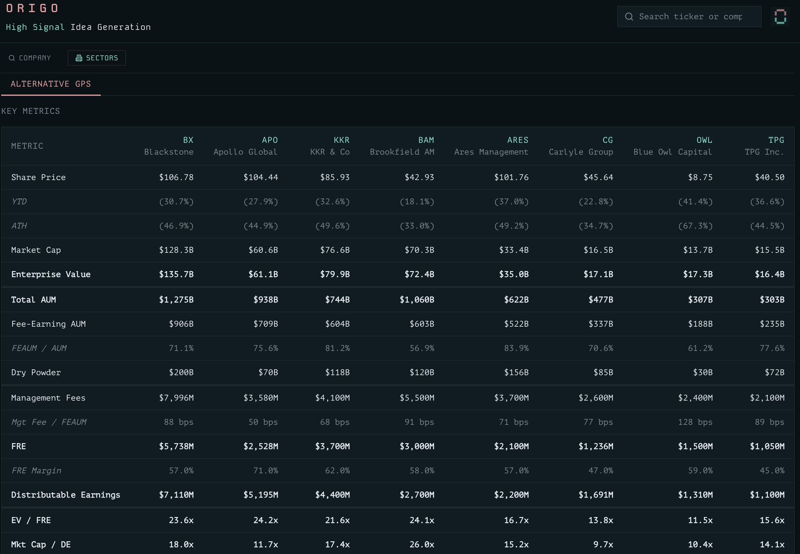 While Alts are coming off arguably elevated levels, we are entering interesting territory relative to where these businesses have historically traded in terms of FRE multiples.